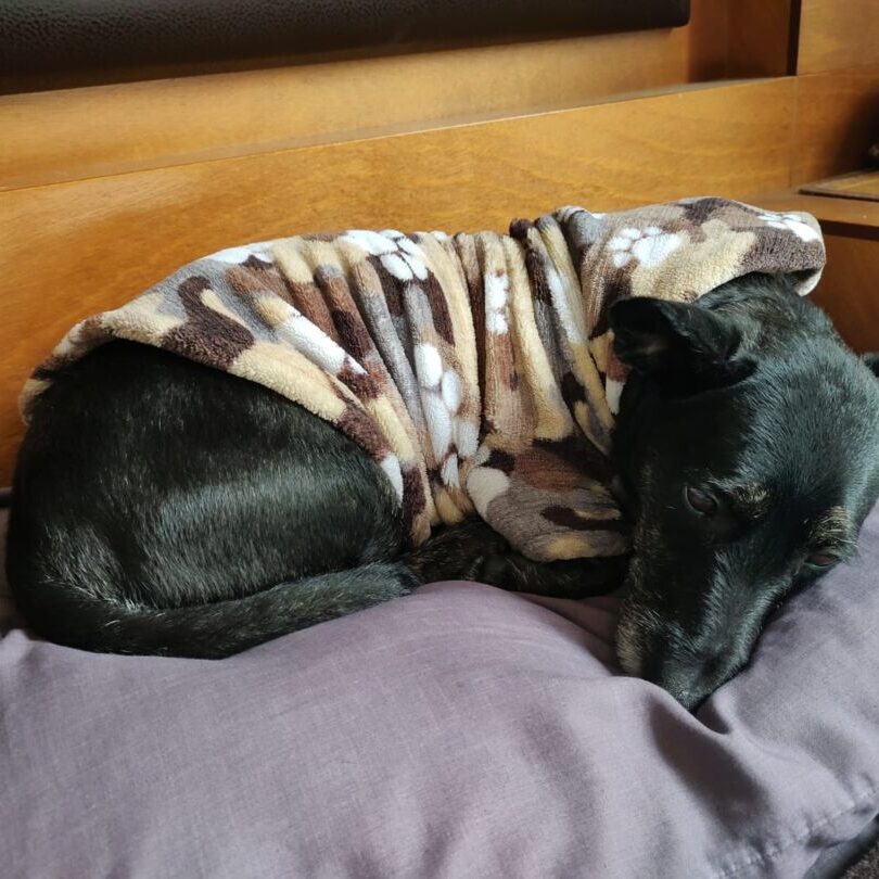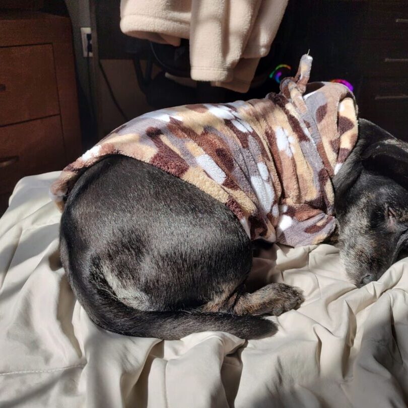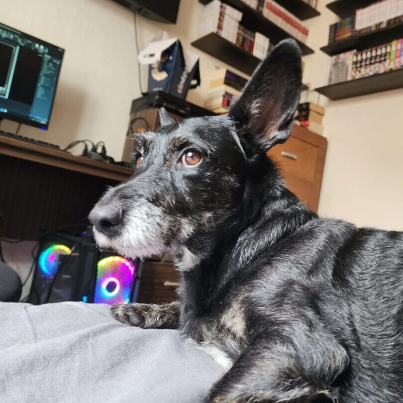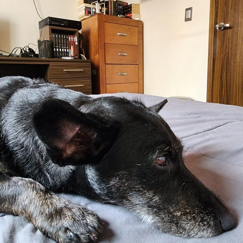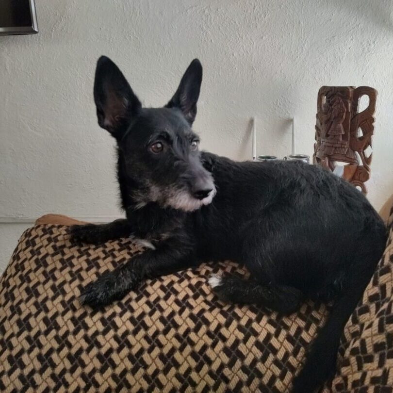 Una perrita hembra color negro con el pecho y el hocico blanco de 7 años de edad. No contaba con collar ni pechera