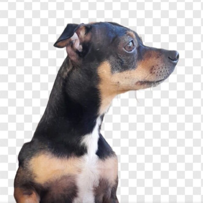 Raza pequeña, negro con café tipo chihuahua pata barba una pata y pecho blanco.