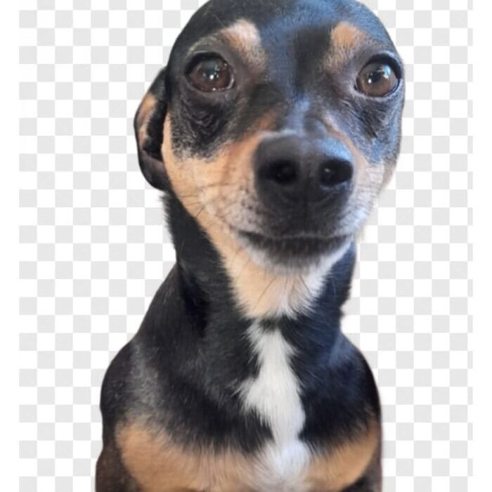 Perrito tipo chihuahua coló negro con manchas cafés, 1 patita blanca, mancha blanca en el pecho y barbita blanca, sin collar ni ropa.