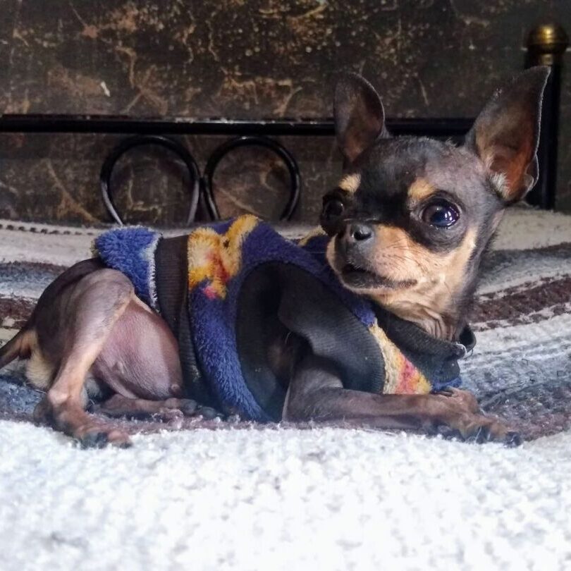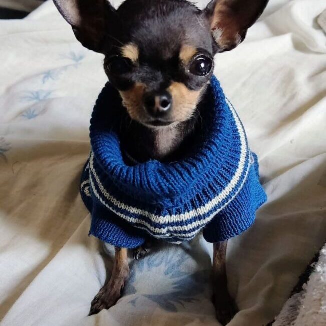 Perrita chihuahua color negro con café claro, es muy pequeña